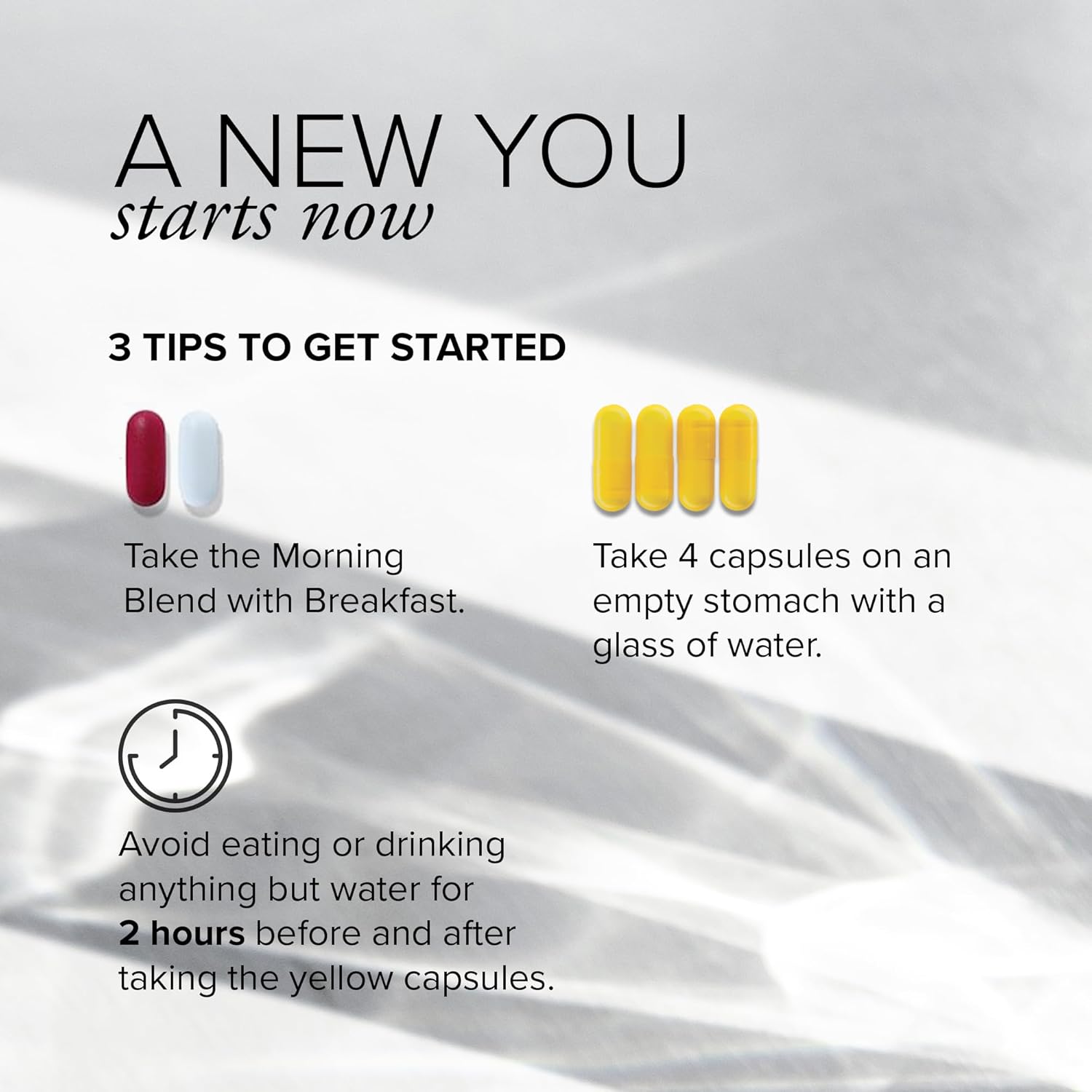 Adults take 1 white tablet and 1 red tablet together in the morning daily with food. Take 4 yellow capsules in the evening, with water, on an empty stomach, two hours after dinner, prior to bedtime. To ensure efficacy, do not eat or drink anything except water two hours before or after taking the yellow capsules. Individual results will vary.
